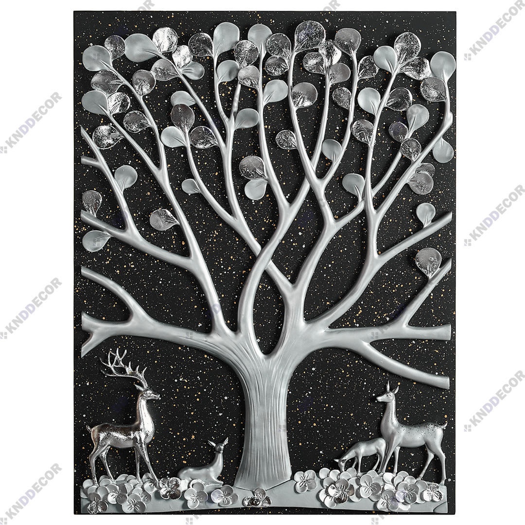 تابلو دکوراتیو 80*60 مدل رزین سه تیکه درخت پالونیا و گوزن نقره ای زمینه مشکی DE8380SB کد FR155