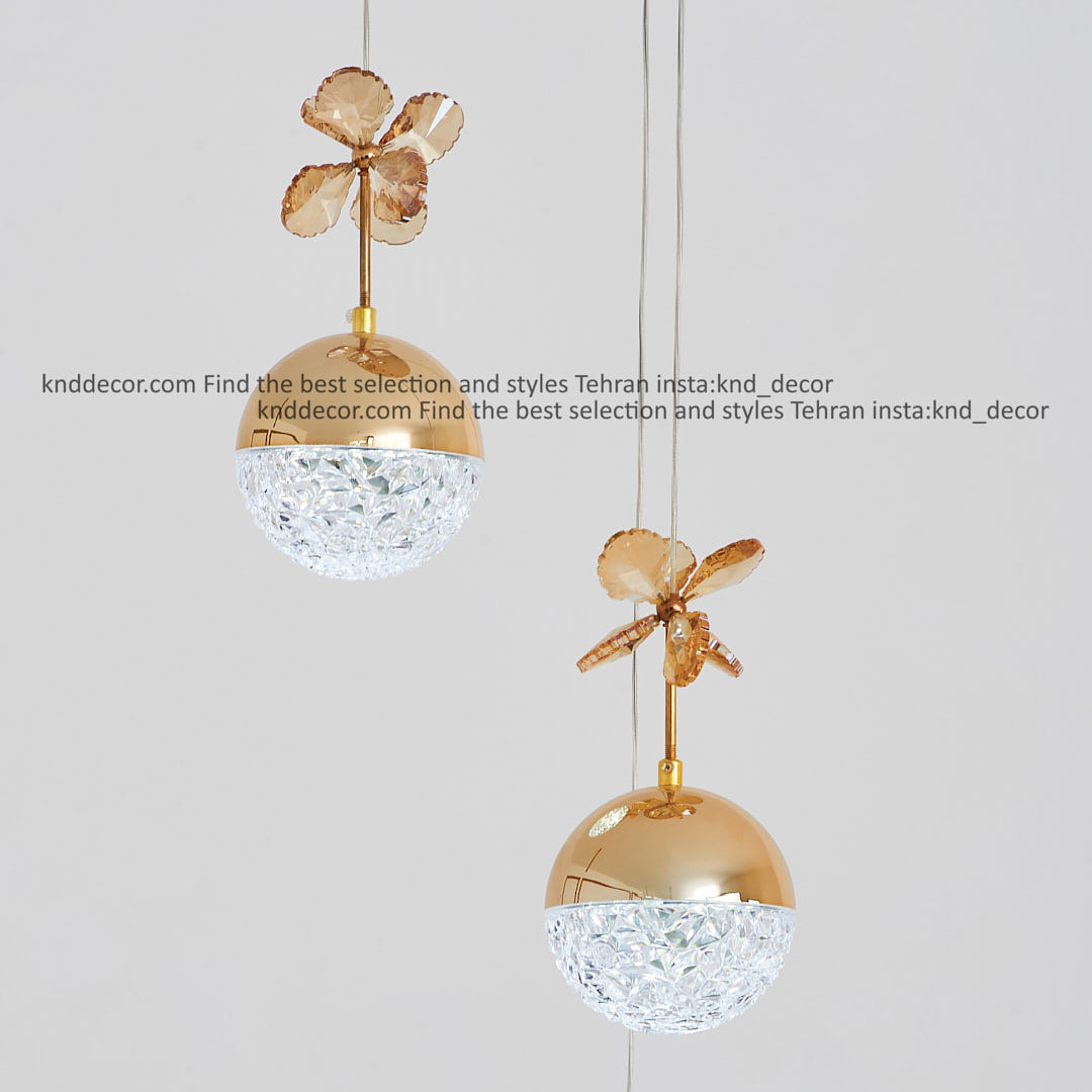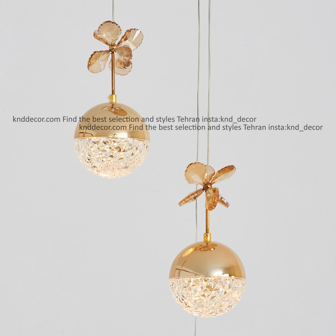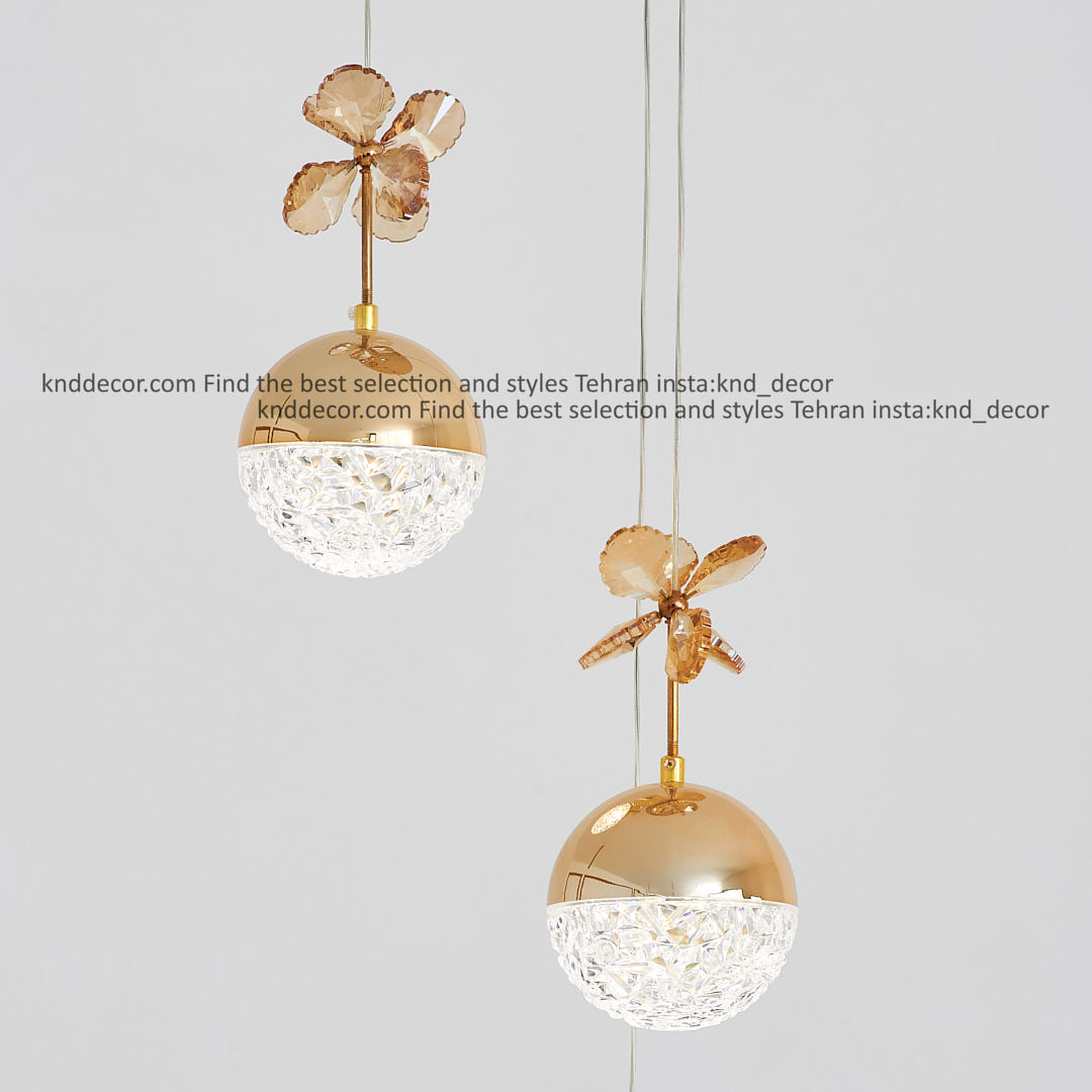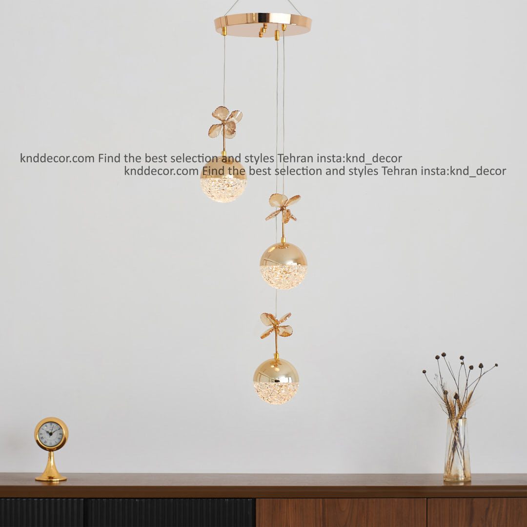 لوستر مدرن طلایی 3 شاخه مدل آویز توپی تک لبه مشجر طلایی با گل با لامپ سه حالته کد LO1002